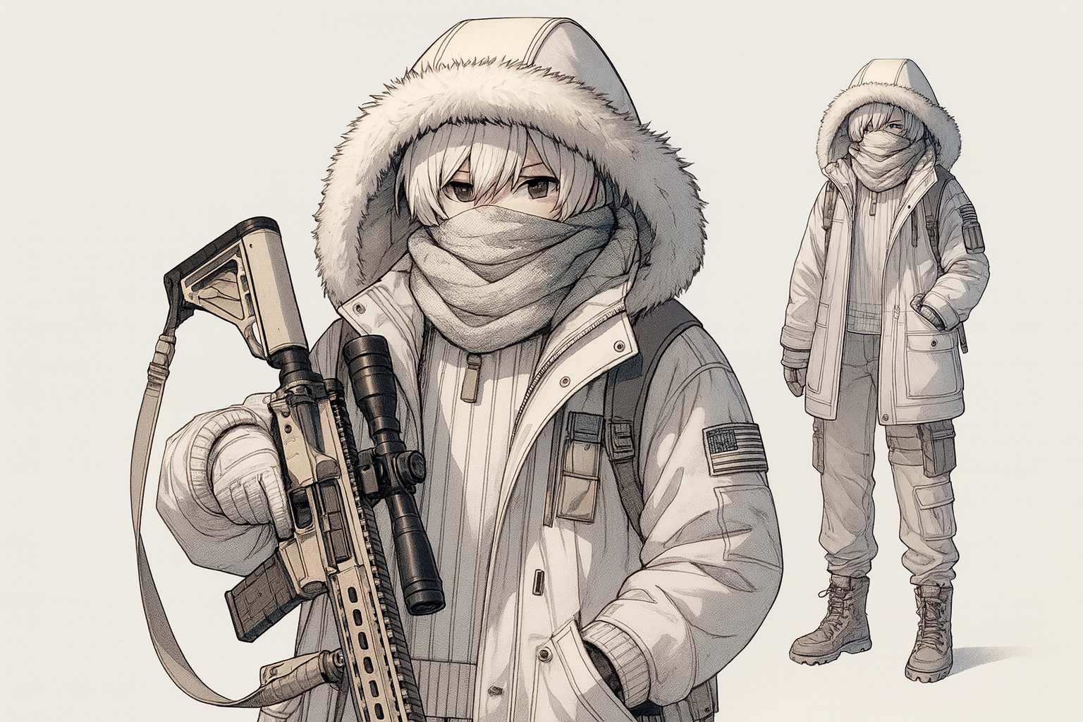 静かで、冷たくて、足音すら感じさせない。 敵がこちらを見つけた瞬間には、もう撃ち抜かれている── そんな静寂の支配者として、作品世界に深い陰影を落としていきます。