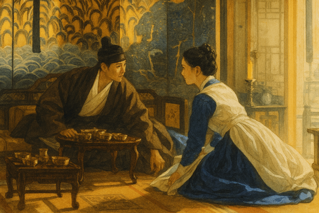 物語はクーデターが発動され、宮中が混乱に陥る中で、ジヨンの命が標的になることによって緊迫します。 王に仕えることを理由に、反乱勢力から“異物”として狙われるジヨン── その瞬間、王はためらわず、彼女をかばって刃の前に立ちはだかるのです。